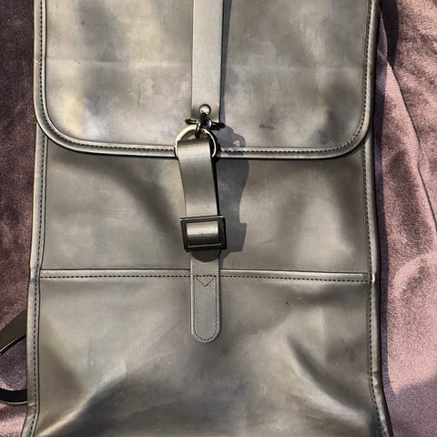 Rains ryggsekk laget av kunstlær. Sekken har en rektangulær form med klaff og stropp foran, justerbare skulderstropper og en glidelåslomme på baksiden. Passer godt til jobb og studier. Sekken har en del bruksmerker så selges billig.