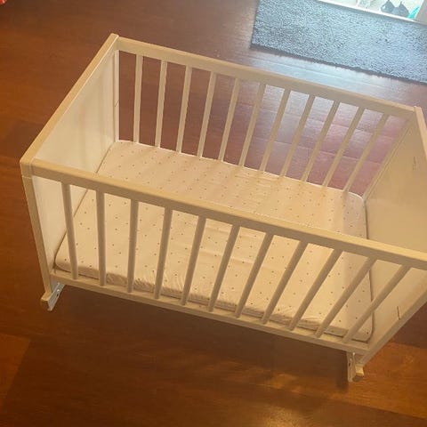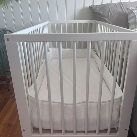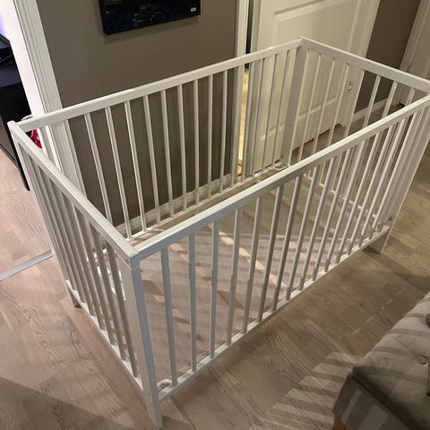 Hel og fin. Ingen mangler. List til å bytte ut en sprinkelvegg følger med. Senga måler 60x120 cm. Madrass kan også bli med, men det er valgfritt 😅