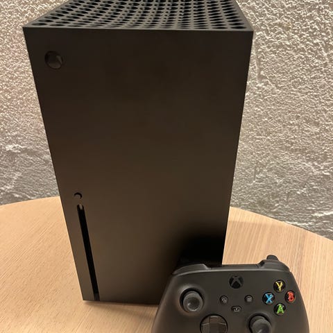 Xbox Series X spillkonsoll fra Microsoft. Svart farge, designet for hjemmeunderholdning og spill. Kompatibel med Xbox Series spill og tilbehør. To kontrollere inkludert