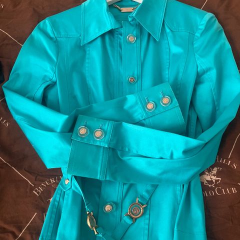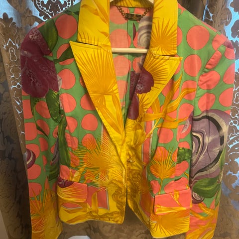 Versace jakke i størrelse S, flerfarget design laget av polyester. Jakken er beregnet for kvinner og har et unikt mønster med flere farger. Finnes ikke i butikk lenger, så er limited edition