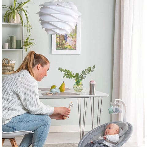 Jollyroom Lenestol til barn i rosa farge. Lenestolen har myk polstring og inkluderer en leke-bøyle med tre myke lekedyr i stoff. Egnet for små barn og kan brukes til avslapning og lek.