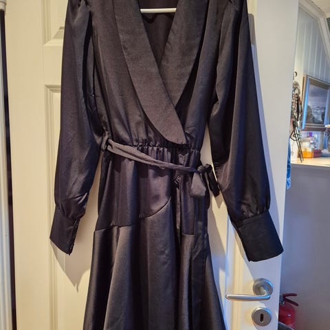 Elegant kjole i sjokoladebrun farge, laget av lett og luftig stoff. Figursydd overdel med delikat, transparent parti ved halsen og et lett utsvingt skjørt i midi-lengde. Ermeløs modell med markert midje.