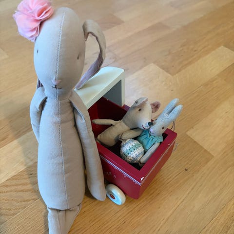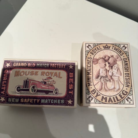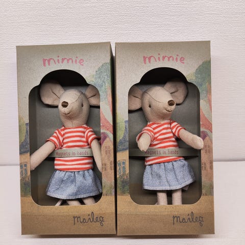 De små musene måler 8 cm og kommer i en eske som fungerer som deres seng. Er en del av Mailegs nydelige serie med mus, som fås i forskjellige størrelser og modeller, med esker som alle er illustrert av Dorthe Mailil. En super søt gaveidé.