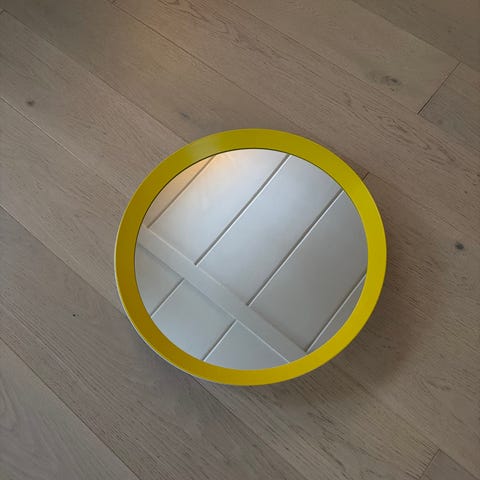 IKEA rundt speil med hvit ramme. Speilet har en enkel og funksjonell design som kan brukes i ulike rom for refleksjon og dekorasjon.