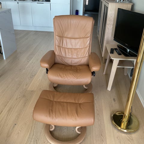 Stressless modell Capri med Classic understell og tilhørende fothviler fra velkjente Ekornes selges. Stolen er i svært god stand, med strøkent skinn i en delikat Creme farge. Nakkestøtten kan reguleres opp og ned, og stolsetet reguleres enkelt ved hjelp av kroppsvekt og låseskruene på hver side av stolen. Sokkelen er laget i teakbeiset tre, og fremstår i svært god stand. Stolen er en drøm å sitte i og har en utsøkt kvalitet, noe som kjennetegner møblene fra Ekornes. Frakt på Østlandet kan ordnes mot tillegg i pris.