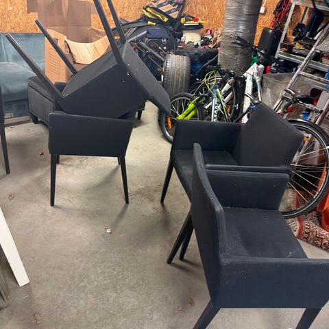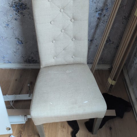 IKEA spisestoler med stofftrekk. Fire stoler med enkel design, egnet for spisestue eller kjøkken. Stolene har stoffmateriale og en nøytral farge. De har godt brukt og trenger en skikkelig rens.
