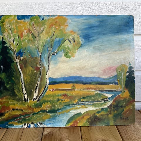 Maleri som viser en fjord med fjell, hus og båter, utført i oljemaling. Bildet har en ramme med dekorativt mønster. Motivet inkluderer fjellandskap, vann, små hus og en person i robåt. Betaling er ønskelig med vipps