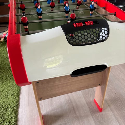 Bartl Flip Kick bordfotballspill laget i tre med fotballbane-design. Spillbrettet har fargerike markeringer og inkluderer to tre-spaker for å styre spillerne.