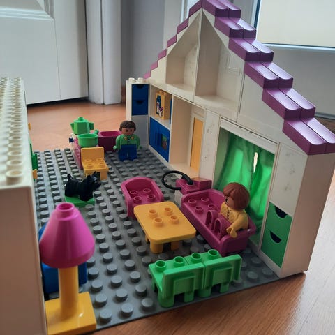 LEGO Alien Conquest bygning med flere etasjer. Bygningen består av ulike rom med detaljer som vinduer, møbler, kjøkkenutstyr, bad, og trapper. Fargene er varierte, inkludert gul, rosa, blå, rød, grønn og lilla. Passer for barn og samlere som ønsker en detaljert og fargerik konstruksjonsmodell.