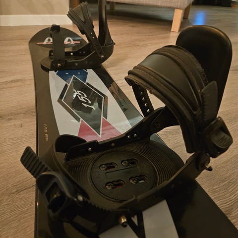 Pro Flyer snowboard med fester for bindinger og inkluderte svarte bindinger. Snowboardet har en flerfarget overflate med svart, hvit, blå og rød design. Hjelmen er hvit med justerbar stropp og ventilasjon. Utstyret er egnet for vintersportaktiviteter som snowboardkjøring.