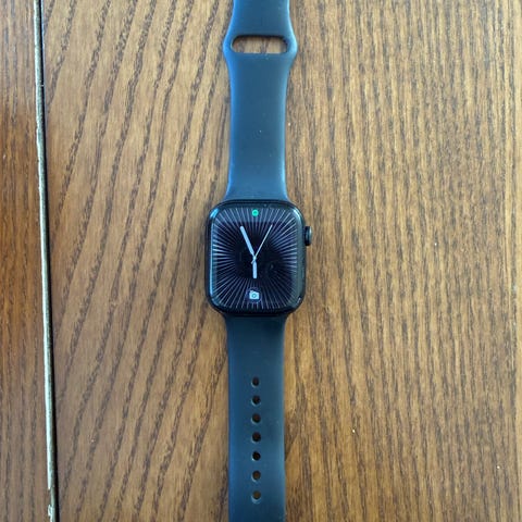 Apple Watch Series 10 smartklokke med svart reim. Klokken har en rektangulær skjerm og flere funksjoner for helse, trening og kommunikasjon. Passer for både menn og kvinner.