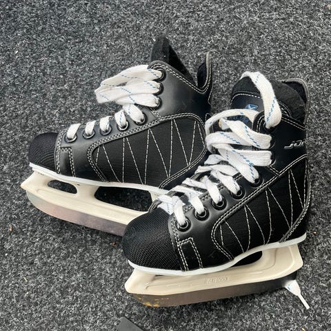 Skøyter for barn i størrelse 30. Skøytene har svart og hvit fargekombinasjon og er laget for ishockeybruk.