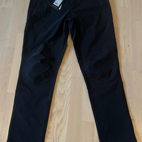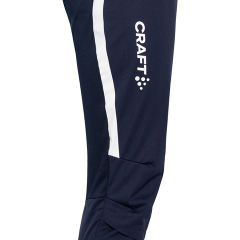 Selger dame treningsbukse som er vind- og vanntett i fronten. Den har lommer i siden, samt glidelås som går opp til overdelen av kneet.