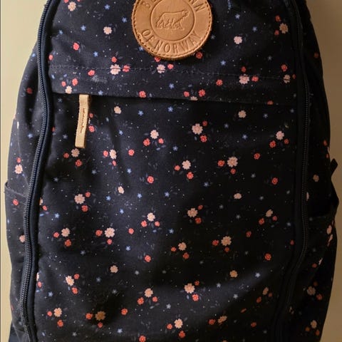 Pent brukt skolesekk, designet av Mina Jacobsen. Passer 4-7 klasse. Regntrekk følger med.