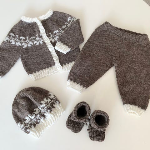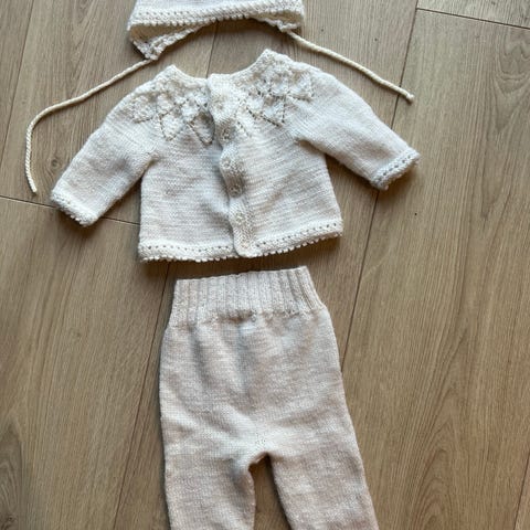 Nystrikket sett i str 0-2 mnd. strikket i tynn merino petit fra Viking- ekstra mykt og fint/tynt garn.farge lys blå.