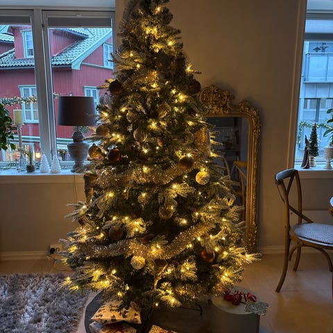 Treet har 750 varmhvite LED-lys med 8 funksjoner og fjernkontroll.