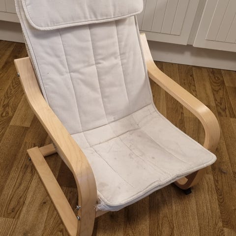 IKEA barnestol i hvit plast med roterbar base. Passer for barn og kan brukes som sitteplass ved skrivebord eller bord. Enkel i design og lett å rengjøre. Det mangler fire plastknotter på beina. Vi har brukt standard filtknotter som erstatning.