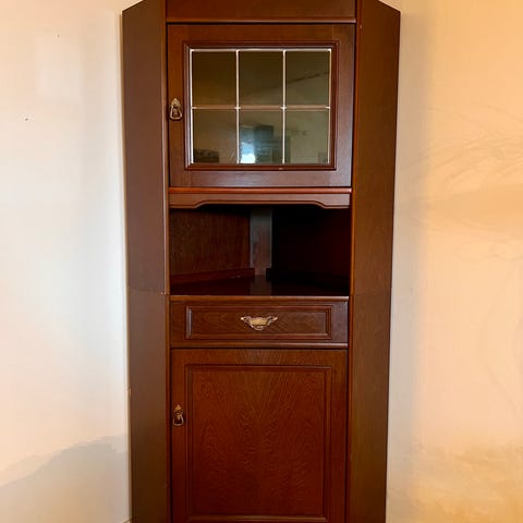 Hjørneskap fra Bohus. Skapet har speil i øverste kammer og en hylle. I nederste kammer er det tre hyller. Det er fungerende lyspærer i begge kammer. Det er løsnet en del av trevirket på baksiden av skapet, men denne kan limes på igjen da vi har den. Skapet må hentes.