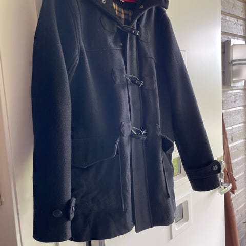 Svart duffelcoat i størrelse XL til salgs.