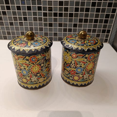 Sett med 6 dekorative krydderkrukker, og 2 større krukker for mel og salt.