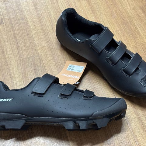 White sykkelsko i størrelse 44, svart farge. Skoene har borrelåslukking og en såle designet for sykling med feste for klikkpedaler. Ikke brukt!