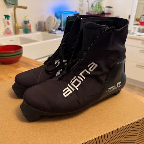 Fjorårsmodellen av Alpina XC Classic skisko for klassisk stil i størrelse 44. Innersåle 29 cm. Brukt kun noen få ganger og er enda ikke "gått inn", så disse fremstår sånn sett som ny.