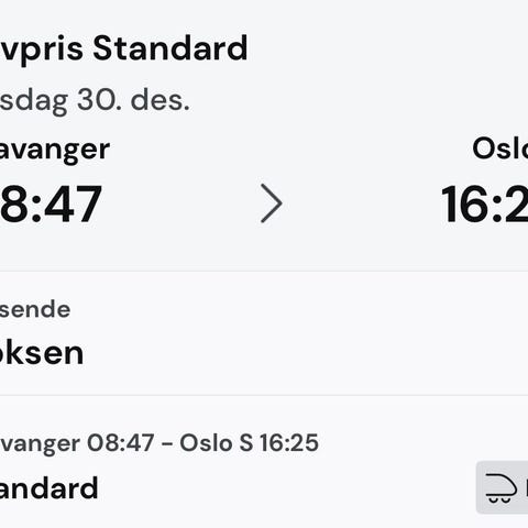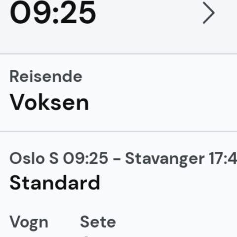 Tågbiljetter tur och retur för en person Oslo-Stavanger.
