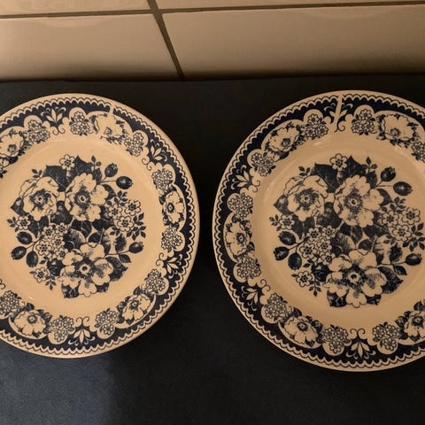 Solide og tykke tallerkener med brun kant, diameter ca. 23,5 cm.