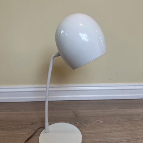 Sjarmerende vintage lampe med hvit porselensfot fra PL Belysning og mønstret stoffskjerm (ukjent merke).