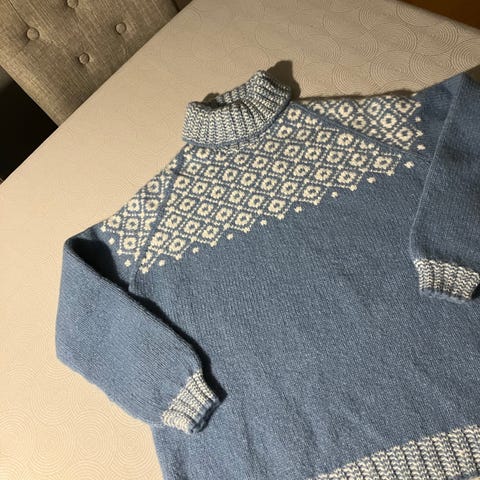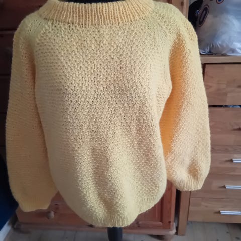 Myk og varm genser, som ikke klør. Strikket i Gann garn sky. Farge lys beige og brun. Hel lengde 61 cm, overvidde 97 cm, underermslengde 45 cm.