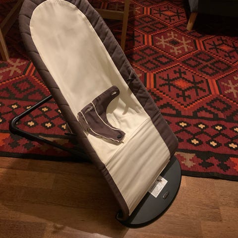 Babybjörn barnestol i stoff med brun og grå farge. Designet for barn, egnet til bruk som sitteplass for små barn. Litt falmet i fargen