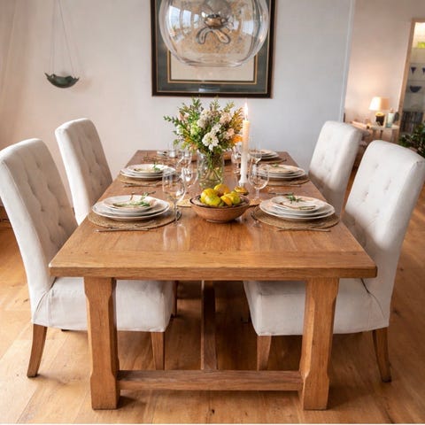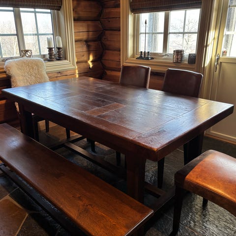 For seg gjort hel eik med innleggs plate. Bordplate er ny pusset og behandlet med Osmo. i meget god stand.