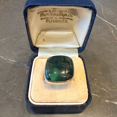 Meget gammel håndlaget sølvring, pyntet med en naturlig svart korall stein på toppen.