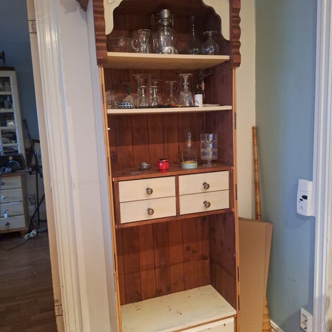 Har hull i den ene siden som er brukt til å ha ledninger gjennom. Noen bruksmerker.
