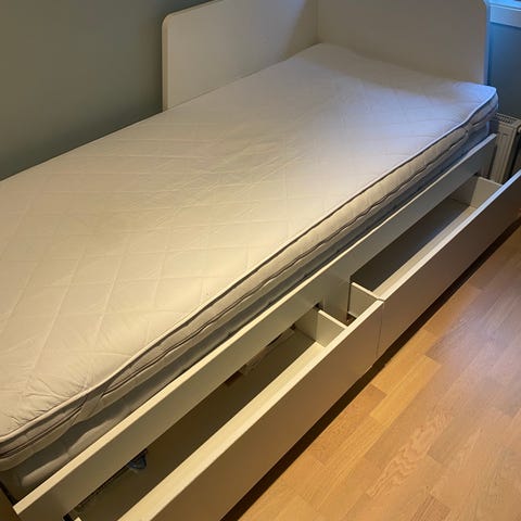 IKEA seng med oppbevaringsskuffer i hvit farge. Sengen har et enkelt og funksjonelt design med to skuffer under for ekstra lagringsplass.