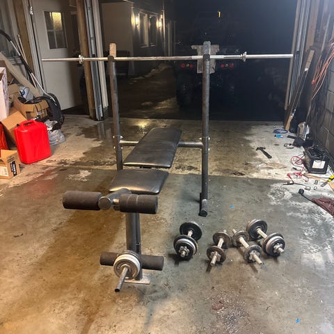 Utstyr egnet for styrketrening og vektløfting i hjemmet eller treningsstudio.