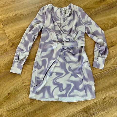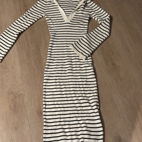 River Island hverdagskjole i størrelse S, laget av bomull. Kjolen er hvit med sorte prikker og har lange ermer. Den har en firkantet hals og en kort lengde, egnet for hverdagsbruk. Den er i størrelse small, men stor i størrelsen.