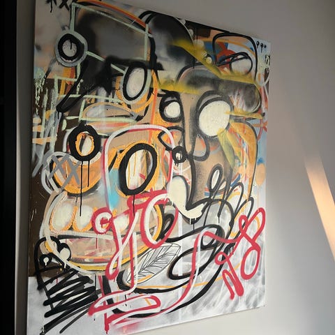 Et monumentalt og visuelt tungt verk innen moderne / urban kunst, med klare referanser til street art og abstrakt formspråk. Sterk fargebruk med dominans av gultoner, tydelige kontraster og grafiske elementer som gir høy tilstedeværelse i rommet. Dette er et maleri som bærer veggen alene.