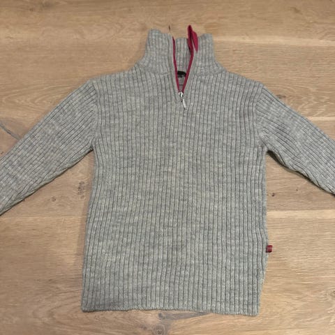 Ullgenser til barn. Den er knapt brukt her, men uheldigvis en flekk på ene armen. Ikke forsøkt fjernet med noe, mulig den går bort. Kun vasket skånsomt på ullprogram med ullvaskemiddel.