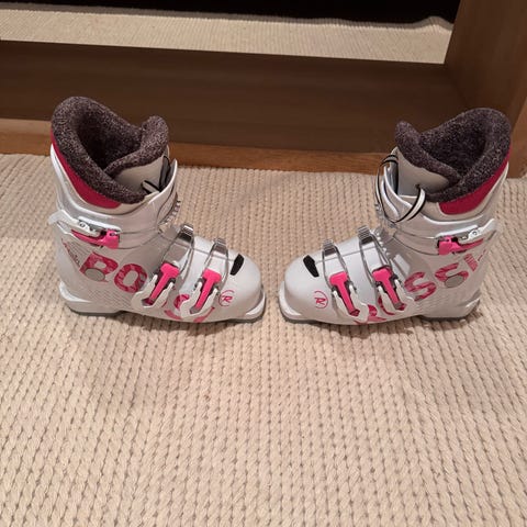 Rossignol Fun Girl alpinstøvler i størrelse 205 mm (mondo 20,5). Støvlene har hvit og rosa farge og er designet for alpinski. De har flere spenner for justering og er foret for komfort.
