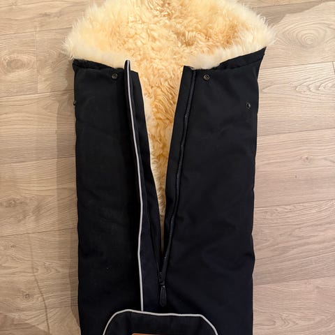 Utrolig god vognpose i ull. Spesialbestilt fra Skinn- Service. Glidelås rundt hele posen. Grå cordfløyel. Åpninger til seler. Er godt brukt, men ingen defekter.