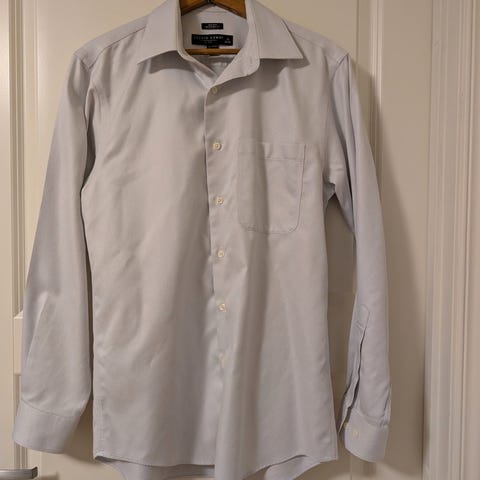 Oversized blazer med knappstolpe foran. Blazeren er beige, vevet og enkelkneppet. Den har krage med jakkeslag med snitt, brystlomme på venstre side og passpolerte lommer med klaffer foran. Blazeren er ikke brukt, bare lappen er ikke på. Helt som ny. Bildene er tatt i forskjellige belysninger.