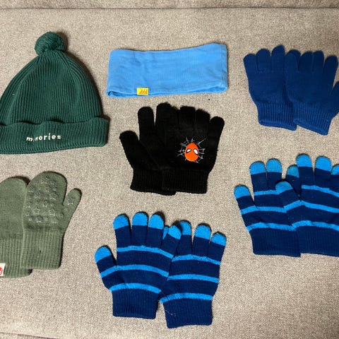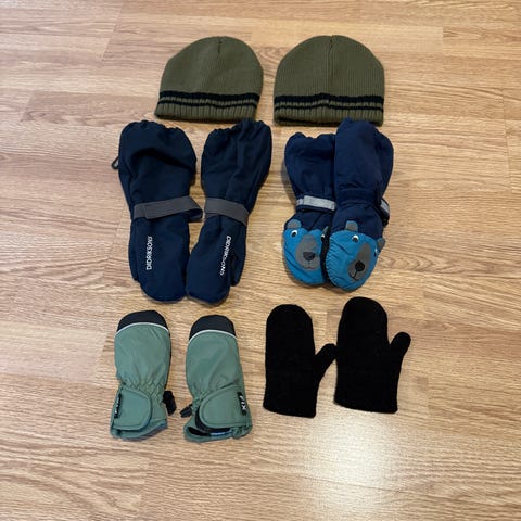 Vinterpakke med 5x lua og 9x tynne votter for barn 1-2år