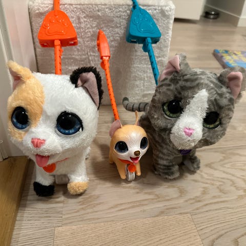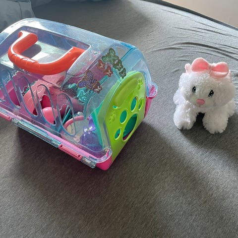 Simba Toy leketøy som inkluderer en katt og et bur. Katten er grå med mørke striper, og buret er rosa med lilla gitterdør. Passer som lekefigur for barn.