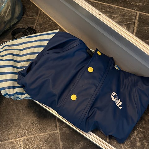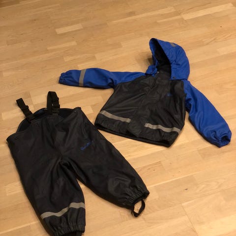 Regntøy med refleks og buksen har seler og jakken har hette som kan tas av.