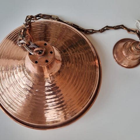 Flott og original norsk taklampe fra Pilar Design A/S, produsert i Gressvik. Lampen har hvitt opalglass med vakker håndmalt blomsterdekor, og gir et mykt og behagelig lys. Typisk 60–70-talls design, svært dekorativ og passer godt både i stue, kjøkken eller hytte. Original produsentmerking er bevart (se bilde). Tilstand: – Ingen sprekker eller nagg i glasset – Dekoren er pen og hel – Normal alderspatina.
