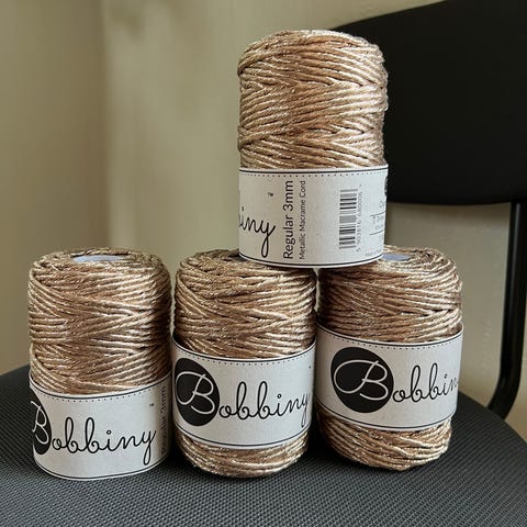 Selger helt nye makrame tråd i fargen gold. Selges for 60kr pr stykk eller 300kr for alle. Ny pris 178kr.