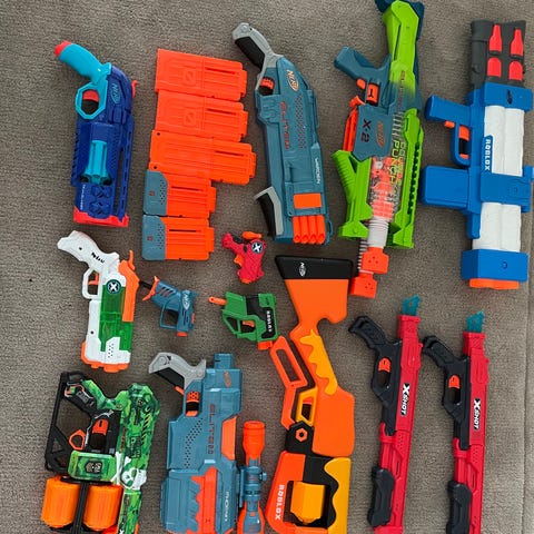 Nerf og Zuru x shot blastere i forskjellige størrelser med 205 skumpiler selges samla.
