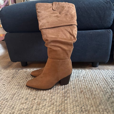 Pene og blanke. Imitasjon, såle av ekte lær. Relativt slankt skaft. Litt slitasje øvre del, men støvlettene ser veldig bra ut. Ca. 8,5 cm høy hel.