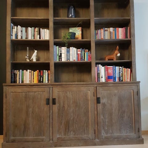 Det er 2 hyller på den ene siden inni og fire hyller på den andre siden. 2 av hyllene har vi lagt til for å få mer plass til servise. Hyllene er rektangulære så det kan fint settes inn flere hyller. Det er god plass til både vinglass, symaskin, bøker og annet